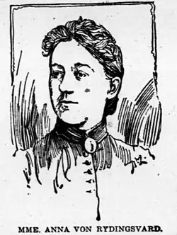 During the course of their marriage, the couple referred to themselves as members of the Swedish nobility,[18] despite Rydingsvärd having no prominent noble descent, a fact that was reported in Boston area Swedish-language newspapers. Anna referred to herself as Baroness von Proschwitz in her translation work, and gave interviews claiming the title.[19] When Anna filed for divorce in 1897,[1] the false claims of nobility were exposed by the English-language press, including the New York Times.[20]