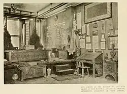 He exhibited his work many times at the National Arts Club[41] where he was a member, He won a life membership as a prize in the 1914 Society of Craftsmen exhibition.[42] In 1908, he exhibited a desk and other smaller articles[43] (his wife Ida also exhibited at this time[44]); his 1909 exhibition comprised seven pieces, including a copy of a 15th century Flemish picture frame;[45] in 1916, a table and chairs;[46] and his 1919 exhibition featured eight sculpted wood panels with scenes of American pioneers.[41]