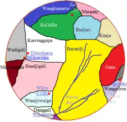 Norman Tindale estimated the extent of their tribal lands at 14,000 square kilometres (5,500 sq mi), reaching from Mount Bygrave in northwestern New South Wales to Woodbum Lake in Queensland. They took in Tibooburra, at Yalpunga and Connulpie Downs, and included the Bulloo Lakes area. Their southwestern boundaries lay in the vicinity of Milparinka, while their eastern frontier ran along Therloo Downs.[1]