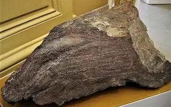 The Karsakpay inscription (also called the Timur's stone)[1] is a message carved on April 28, 1391[2] into a fragment of rock in Ulu Tagh mountainside near the Karsakpay mines, Kazakhstan. It was found in 1935.[2][3] It consists of three lines in Arabic, and eight lines in Chagatai, written in the Old Uyghur alphabet.[4]