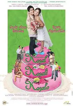Kasal, Kasali, Kasalo (released on Netflix as Wedded, Worried, Wearied;[1] Wedding, Joining In, Partaker) is a 2006 Filipino romantic comedy film written and directed by Jose Javier Reyes and it was based on a written screenplay by Mary Ann Bautista. It was an official entry for the 2006 Metro Manila Film Festival. It stars the real-life couple, Judy Ann Santos and Ryan Agoncillo as Angie and Jed and also starring Gina Pareño, Gloria Diaz, and Ariel Ureta.