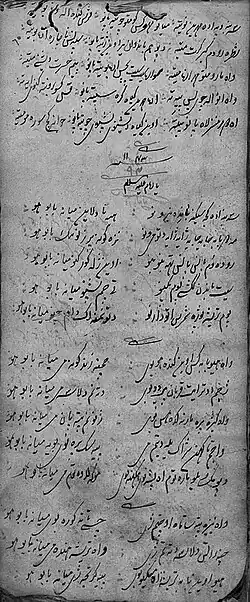 The oldest trace of a marsiya in Kashmiri language dates to the 15th century CE and comprises a short, loose elegy composed on the death of a Sufi, Nund Rishi (d. 842AH/ 1438CE),[8] by his women disciple, Sham Bibi (d. 1446).[9][10] The first elegies written in Kashmiri to commemorate Husyan's martyrdom also date from the same period in works composed between the 15th and 16th centuries. These include marsiya written by two poets from the Musavi family,[11] Qasim bin Yusuf Din Shah, and his nephew Hakim Din Shah[12] in and around 811- 850 AH (1409-1446CE), during the Shahmiri Sultanate (1339-1561CE).[4][6][5][13][7][14] Another work that survives is of Ahmad, a poet who hailed from Ahmadpora, a Shia centre of learning in medieval Kashmir.[5][15]