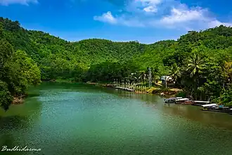 The Cikaso River originates in North Sukabumi and flows south to the Surade subdistrict in South Sukabumi.[3] The Cikaso waterfall is in the Ujung tourist area between Jampang Kulon and Surade. The waterfalls have a height of almost 80 metres (260 ft), with three parallel drops along cliffs that are about 100 feet (30 m) wide. The falls are accessible from the Ciniti, Cibitung village in the Cibitung Kulon sub-Jampang. They can be reached by foot or by motor boat.[4]