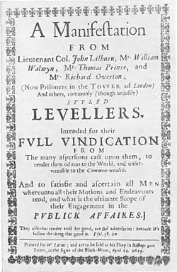 By this time she had emerged as a leader of Leveller women and seems to have been involved in their petitioning of Parliament. On 29 April 1649 the English Council of State committed to prison the Leveller leaders John Lilburne, Richard Overton, William Walwyn and Thomas Prince, who owned a book critical of the regime, England's New Chains.[68] The House of Commons agreed that they should be tried under Common Law on 11 April.[69] The House was under a constant bombardment of petitions on behalf of the arrested Levellers, and women mobilised in numbers. On 23 April Bulstrode Whitelocke observed: