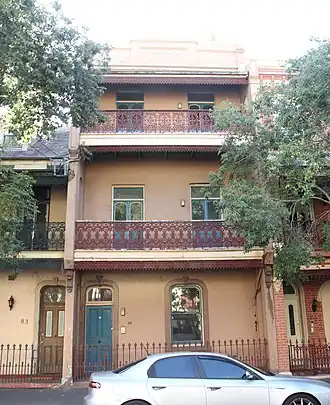 A large, three storey Victorian Italianate house in good condition. Very important rear wing is lined by Victorian balconies (the upper floor built post 1880). This residence has four bedrooms. Storeys: Three; Construction: Painted rendered masonry walls, slate roof to main body of house, corrugated galvanised iron to balcony verandah, and rear wing. Cast iron balcony lace. Style: Victorian.[1]