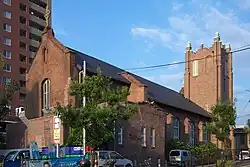 Due to many of the foreign businessmen and traders moving on to other settlements like the Kobe foreign settlement, missionaries from various Christian denominations came to fill the vacuum, and as a result, the settlement became a nucleus of Christian evangelism.[1] The Meiji government explained that even though the ban on Christianity is not abolished, the freedom of evangelical activities were permitted in the foreign settlement. These missionaries, initially denied settlement during the auctions of 1868, rebuilt empty lots left behind with churches, hospitals, orphanages, and more. In 1884, out of the 26 original plots, 20 became Christian facilities and residences for missionaries. Notable buildings founded by Christian missionaries were the St. Agnes School, Poole Girls' School, Osaka Jogakuin Jr. and Sr. High School, St. Andrew's University, Rikkyo School, Osaka Shinai General School, and St. Barnabas Hospital.[2] It was under the pressure of these missionaries that the Meiji government acquiesced to open up ten additional plots.