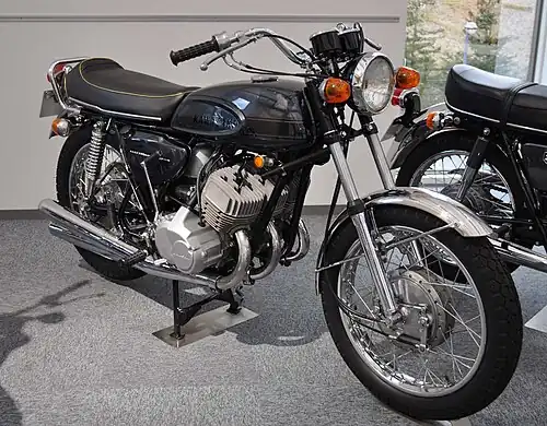 The result of this project was the H1 Mach III, with a 15° inclined, inline-triple 498 cc (30.4 cu in) engine, first produced in September, 1968, 14 months after the N100 project began.[2][6] The new model did indeed sell well with young men in the late 1960s, with total production eventually exceeding 110,000 units, though it was unpopular with authorities.[2][6] The bike gave Kawasaki a "rebel" image, "outside the law", which played well with sport bike riders.[3] The racing version, the H1R ridden by Ginger Molloy, took second place in the 1970 Grand Prix World Championship.[3]
