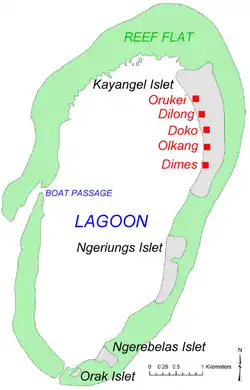 2. ^ Olsudong, Rita (2006). Final Inventory of Historic Properties in Kayangel States, Republic of Palau. Bureau of Arts and Culture, Palau Historic Preservation Office, Ministry of Community and Cultural Affairs.