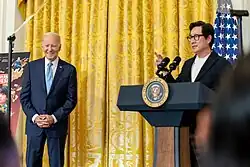 Quan was inspired to return to acting following the success of Crazy Rich Asians in 2018.[23] In 2019, he was cast in a supporting role in the Netflix film Finding ʻOhana, released in 2021.[24] Quan approached director Jude Weng after overhearing her describing the film as The Goonies meets Indiana Jones, in both of which Quan had appeared.[20] That same year, the filmmaking duo Daniels began casting for their film Everything Everywhere All at Once. They struggled to cast an actor in the role of Waymond Wang, a character who would appear in three different incarnations of the film. Co-director Daniel Kwan stumbled upon Quan on Twitter. Two weeks after getting a talent agent, Quan received a call to audition for the film.[20] In January 2020, Quan was announced as a cast member of Everything Everywhere All at Once.[25] The film was released in March 2022 to overwhelming acclaim, becoming the most-awarded film of all time,[26] with Quan's performance receiving near unanimous praise and media attention, eventually leading to him winning a Golden Globe, a Screen Actors Guild Award and an Academy Award for his role. The Screen Actors Guild Award win made him the first Asian man to win any individual category at the Screen Actors Guild Awards, with his win of the Screen Actors Guild Award for Outstanding Performance by a Male Actor in a Supporting Role. He was the first Vietnamese-American actor to be nominated in that category.[27][28][29][30] Quan is one of two actors of Asian descent to win an Academy Award for Best Supporting Actor, the other being Haing S. Ngor in 1985,[31] and is the first Vietnamese-born actor to win an Academy Award.[32]