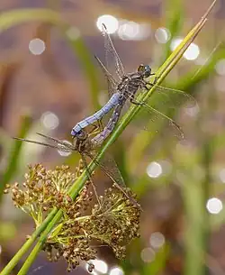 Adults fly (in the UK) from June to September.[4] Its flight is quite skittish, with frequent hovering, and it lands often. It can fly quite a distance from water, despite its seemingly weak flight. When it perches, the wings are held forward. This species breed mainly in peat bogs. The mating lasts between 5 and 120 seconds. The mating wheel usually lands, but not always. After copulation and a short rest period on the side of the male, the female flies, followed by the male to the water and lays the eggs in flight by touching the surface of the water. The larvae develop in running water but also in stagnant waters (ponds, peat bogs, etc.). After five to six weeks, the larvae hatch. Their development cycle is estimated in two years.
