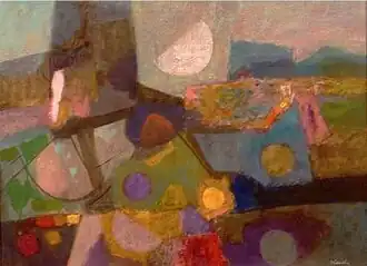 Although he painted many portraits, he is best known for his semi-abstract landscapes, like the untitled painting at right. They are usually uninhabited and have symbolic meanings.[4][5] The Hawaii State Art Museum, Honolulu Museum of Art and the Smithsonian American Art Museum (Washington, D. C.) are among the public collections holding works by Keichi Kimura.