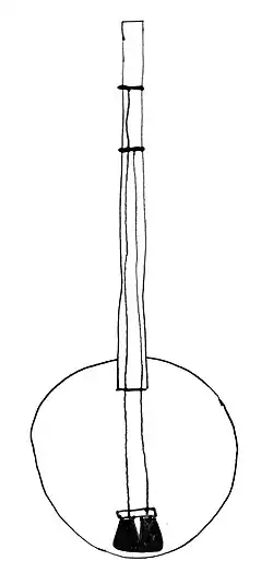 It is strung with two or three strings, traditionally, strings made from goat sinew.[1] Today nylon strings are common.[1] The bridge is a length of a stick laid on the soundboard next to a soundhole.[1] The strings coming from the neck pass over it and down through the soundhole into the bowl, to attach to the butt of the neck.[1] The soundhole is about 30mm tall by 50mm wide.[2]