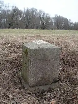 In 1877, the Sieg was channelled to flow into the Rhine at almost a right angle, near the then fishing village of Bergheim (now part of Troisdorf),[5] but the river continued to form meanders and loops leading to a total of four river mouths, and there was heavy silt deposition in both the Sieg and the Rhine; the islands became joined and the navigable portion of the Rhine narrowed to a channel beside the opposite bank, the so-called "Rheindorfer Kehle", and flooding occurred at times of high water. In 1851, the Sieg was re-channelled through one of its arms, the "Hartfurth", to restore the angled confluence, with the Rhine bank being built up upstream. Where the primary mouth of the Sieg had been after the earlier works, the Kemper Werth was joined to the mainland at its southern end by a causeway, becoming a promontory; the causeway was raised in 1854 after the Rhine overspilled it.[6][7] The Sieg now flows almost parallel to the Rhine past the promontory, entering the river between the Mondorf section of Niederkassel and Geislar, which is the northernmost part of Beuel, the right-bank section of Bonn.[8] In the 19th century, a myriametre stone was installed on the promontory; these mark measured points along the course of the Rhine.[3]