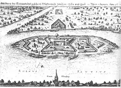 In 1620, the islands were occupied and a fort constructed by forces of the States General of the Netherlands, in one of several pre-emptive strikes against the Spanish and in support of the claim of the Elector of Brandenburg, Georg Wilhelm, to the territories of Jülich-Berg during the Eighty Years' War.[1] In 1622 and 1623, the Spanish took the fort.[2] Only archaeological remnants survive.[3] The double island acquired the name Pfaffenmütze or Pfaffenmütz (priest's cap) at this time,[1] either as a political gibe[4] or because of a resemblance of shape.[5]
