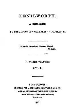 Kenilworth was published in three volumes by Constable and Ballantyne in Edinburgh on 13 January 1821,[3] and by Hurst, Robinson, and Co. in London on the 20th. As with all the Waverley novels before 1827 publication was anonymous. The print run was 10,000, with a further 2000 in a second edition which followed two months later, and the price was one and a half guineas (£1 11s 6d or £1.57½). It is unlikely that Scott was involved with the novel again until April and May 1830, when he revised the text and provided an introduction and notes for the 'Magnum' edition in which it appeared as Volumes 22 and 23 in March and April 1831.[a]