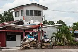 Keningau Airport's old control tower with Piper PA-28 Cherokee Aircraft Family at display