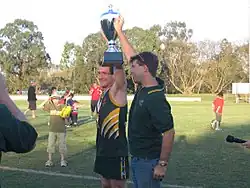 Peter Stowasser (Captain) and Jeff Williams (Coach) raise the Premiership Trophy