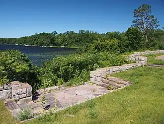 At the southeast end, the overlook broadens into a terrace. Symmetrical 16-foot (4.9 m) sections of wall flank a recessed area paved with flagstones which gives onto a staircase leading down to the lakeshore.[2]