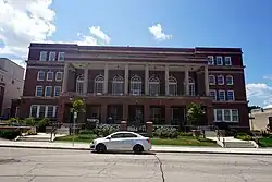The building is red brick, four stories tall, with Georgian Revival styling. The first story is rusticated brick, somewhat resembling Richardsonian Romanesque styling. The corners are decorated with quoin patterns in the brickwork. The front portico is the striking feature, with two-story Doric columns on square brick piers, and behind them brick pilasters framing round-arched windows with fanlights.[1][2]