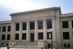 All grade levels of the University School were held in the same building. The first two buildings that housed the school—Merrill and Kent Halls—were also home to other university programs and departments. Merrill Hall, for instance, was the first building built on the KSU campus, while Kent Hall—known until 1938 as Science Hall—initially served as the home of the science classes. The school's first exclusive home, known as the William A. Cluff Teacher Training Building, would serve as the school's home for nearly 30 years. Athletic fields for the high school first appear in the 1942 map of campus and were on the opposite side of the campus from the Cluff building.[10] The school had its own athletic facilities once it moved to what is now the Schwartz Center, as the building included its own auditorium and gymnasium. Athletic fields were located just to the east of the building along Summit Street and included a running track.[11]
