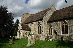 The Church of St. Mary, located in the centre of the village, is an ancient stone building constructed in the Decorated style.[2][8] The church consists of a chancel, nave, small south porch, and a small western tower that once held three bells.[8] Noteworthy features of the church include well-preserved 18th-century box pews, considered to be among the finest examples in Suffolk. Inside the nave, traces of paintings can still be observed on the north wall, including depictions of the "Three Quick and The Three Dead".[8] The church remains active offering regular service and as a hub for community events.
