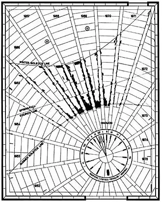 The curved lines on the plaza mark the location of the summer and winter solstices and show the path of the shortest and longest shadows of the year. The straight east–west line locates the path of the Spring and Fall Equinox. The times inscribed on the stone outer circle represent natural or "Sun" time. The walkways are located at the mean position of Eastern Standard Time. The inner circle is marked with words from Ecclesiastes which reflect upon the nature of time and the seasons.[4]