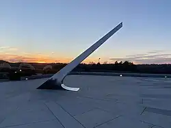 The gnomon, or pointer, stands 14.6 ft (4.46 m) above the surface of the plaza and is 24.3 ft (7.40 m) long, measured along its spine. The angle of the gnomon is equal to the latitude, or 38°10'25" from horizontal, and points to the true North Pole and Polaris, the North Star. The gnomon was cut from 316 inch (4.8 mm) thick stainless steel and fabricated in Springfield, Oregon, by metal sculptor and welding engineer Arthur Ross Cady.[5]