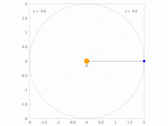 The orbital radius and angular velocity of the planet in the elliptical orbit will vary. This is shown in the animation: the planet travels faster when closer to the Sun, then slower when farther from the Sun. Kepler's second law states that the blue sector has constant area.