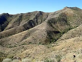 The Canovas Canyon Formation is a sequence of rhyolite flows, tuffs, domes, and associated shallow intrusions exposed primarily around Bear Springs Peak (35°40′08″N 106°33′32″W / 35.669°N 106.559°W). The formation is named for exposures in Canovas Canyon (35°36′25″N 106°34′23″W / 35.607°N 106.573°W). It has a maximum exposed thickness of 300 meters (980 feet) and extends to Borrego Mesa to the southwest.[9] Isolated exposures are found further to the east as far as the San Miguel Mountains.[10] The formation is generally overlain and interbedded with flows of the Paliza Canyon Formation. It overlies beds of the Santa Fe Group.[9] Radimetric ages for this formation range from 12 to 8 million years.[7]