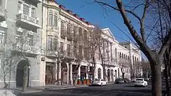 5 House of Musa Nagiyev Khagani alley, 14 The building was built in 1910 by the order of Musa Nagiyev. Ploshko used the classical style and order system style direction of the style. Large pilasters of ionic columns connected the risalites in the corner and the central part in the form of a portico for two floors. The rhythm of the window openings with alternating curved and rectangular sanders, expensive frames determines the volume plasticity of the facade, which is distinguished by a proportional distribution of traction between the floors and a successfully increased cornice. Renaissance balcony railings on the facade attract special attention and actively participate in the formation of the artistic image of the house.[7]