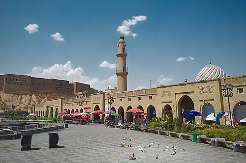 The mosque and its adjoining Sufi lodge were founded in 1805 by the Kurdish Muslim scholar, Mullah Hidayatullah al-Arbili, on the orders of a Naqshbandi dervish named Mawlana Khalid al-Naqshbandi.[1][2][3][4] The local Naqshbandi dervishes of Erbil served as the management for the religious complex, amongst them Sheikh Muhammad Salih who supervised a complete rebuild and renovation in 1961.[1][2][3][5] A marketplace was developed around the mosque, as well as the Shar Park opposite it.[1][2][3] The surrounding citadel was added to the UNESCO World Heritage List in 2014.[6]