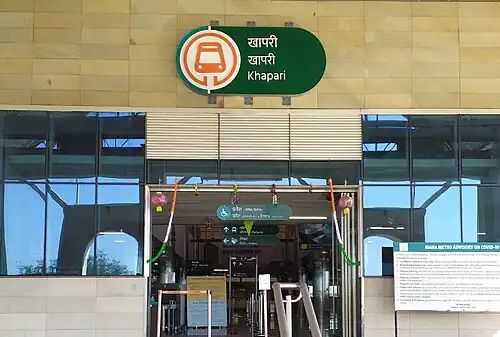 Khapri is the at-grade southern terminal metro station on the North-South corridor of the Orange Line of Nagpur Metro in the city of Nagpur, Maharashtra.serving the Khapri area of Nagpur. It was opened to the public on 8 March 2019.[1] The station is integrated with the Khapri railway station, and is linked with Wardha Road via a subway that passes under the main railway line.[2]