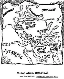The empire of Khokarsa was centered on the shores of prehistoric Africa's two great landlocked seas: the Kemu to the north in the Chad Basin and the Kemuwopar to the south in the Congo Basin. Around 13,000 BCE, a group of tribes called the Khoklem (the People of Kho) emigrated from the temperate savannas of what would later become the Sahara Desert after the end of the Ice Age, reaching the shores of the Kemu and pushing the Neanderthals and Neanderthal-human hybrids (the Klemqaba, or People of the Goat) to the south, and possibly assimilating some of them. Another group called the Klemsuh (the Yellow People) arrived in the area at about the same time. These peoples made a living fishing and hunting and gathering, until the appearance of Sahhindar, the Gray-Eyed God, who taught them agriculture and advanced their culture dramatically. In 11,800 BCE, the hero Gahete of the Klemreskom, the People of the Fish-Eagle, was the first human to land on the island of Khokarsa in the northern Kemu. This island would eventually become the capital and hub of the great Khokarsan Empire. In the series, Opar is merely a mining outpost city in a much larger civilization created by Farmer.
