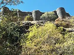 Kakavaberd / Geghayo, Keghayo, Geghi, Keghi fortress, Tatul fortress / are brilliant fort-construction models of historical Armenia. It is located 12 km to the south-east from Garni, on the right bank of Azat river. The fortress now exists and is quite well preserved. It is inaccessible from three sides as it was surrounded by natural gulfs (abysses / precipices) and huge rocks. The forth side is fenced / enclosed as it was not protected by natural barriers. The walls / fences prolonged to the north-east have 2–2.5 meters thickness, near the gate the thickness is 2.60 m. The height of the walls is 8.15 m. The northern towers are eight and their height is more than 10 meters. There are anterooms at the bottom of some towers, as well as there is a round room and small windows inside some of the towers. There is a chapel dug / carved out of the rock with a cross carved on the front at the entrance near the gate of the fortress. The citadel is situated on the western side of the fortress. There are noticeable building ruins, too. The fortress took the name "Kakavaberd" as there are numerous partridges / willow ptarmigans thereabout; the original name was "Geghama Monastery" after the name of the highland. Kakavaberd is also called Tatul fortress, as it is very similar to Tmkaberd in Javakhq. Hovhannes Draskhanakerttsi (9–10 centuries) was the first to mention about the fortress during the description of the retreat of Arab general / military leader Bsheri who was defeated during the sea battle in Sevan by Ashot Erkat /Iron/ Bagratuni. In the 11th century the fort was owned by the Pahlavunis and in the 12–13th centuries the Proshyans were the rulers here. Later on, Stephanos Orbelyan left a written memoire about the fort giving Geghi name to the fort where he described the battle held near Garni village/city in 1225. There is no precise data on the foundation and destruction of Kakavaberd fort. It was probably destroyed in 1679 from the earthquake after which it was not reconstructed.[18]
