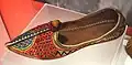 Sindhi Khusso, Multani Khussa or simply just Khussa (Urdu: کُھسّہ), is a traditional footwear[1] produced in Sindh and Multan in Pakistan.[2][3][4] Khussa are hand-made by local artisans mostly using vegetable-tanned leather. The uppers of Khussa are made of one piece of leather or textile, which is embroidered and embellished with brass nails, cowry shells, taunra, mirrors, bells and ceramic beads. Even the bonding from the upper to the sole is done by cotton thread that is not only eco-friendly but also enmeshes the leather fibers with great strength. Some product range also uses bright and ornate threads.[5]
