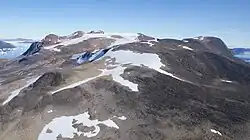 There is a number of smaller mountain lakes on the island, and one larger Tasersuaq Lake at the lower, eastern end of the island.[3] The island is very mountainous, with a glaciated ridge spanning its entire length. The highest point on the island is an unnamed peak of 940 m (3,080 ft) in the center of the island. Several other summits of the island ridge exceed 700 m (2,300 ft), from the massif overlooking Tasersuaq Lake in the east to the bastion over the Wilcox Head promontory in the west.[3]