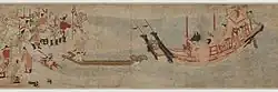The people of Japan are always represented in emakimono, which therefore constitute valuable historical documents on the daily life, landscapes and culture of the Japanese archipelago. In the Kibi Daijin Nittō Emaki, Tang dynasty China, where the story takes place, is not painted with great precision, but several Japanese elements, in particular the boat used by Kibi and the dishes he brought from Japan as a diplomatic gift, are much more detailed. The paintings in the work also depict the game of Go, which has existed for millennia in Asia, as it was practised at the time of the work's creation, and that has actually changed very little since then.[9] The introduction of Go to Japan is also sometimes attributed to Kibi.[15]