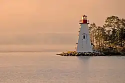 The Kidston Island Lighthouse is a lighthouse on Kidston Island, located in the Bras d'Or lakes, in Baddeck, Nova Scotia. The original lighthouse on Kidston Island was built in 1875.[3] The present lighthouse was built in 1912 and the two stood side by side for some time. The lighthouse can only be accessed by boat; a ferry operates during the summer months.[4]