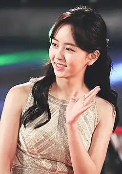 Kim has been dubbed by several Korean media outlets as "Nation's Little Sister", "Queen of Child Actresses", as well as "Goddess of Sageuk" after starring and appearing in various acclaimed historical period dramas throughout her career.[3][4] She has also been called the "Nation's First Love" from her performance in the film Pure Love (2016),[5][6][7][8] and has established herself as a next generation hallyu star.[9][10] For her performance in River Where the Moon Rises, she was nominated for Baeksang Arts Award for Best Actress – Television, becoming one of the youngest nominees for the award.[11]