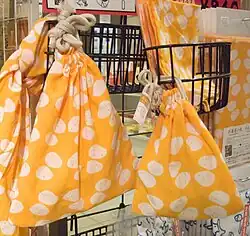 Kinchaku (巾着, lit.'cloth + wearing / on one's person') is a traditional Japanese drawstring bag, used like a handbag (similar to the English reticule) for carrying around personal possessions; smaller ones are usually used to carry loose coinage (similar to a sagemono), cosmetics, lucky charms, hand warmers and other small items. Larger versions can be used to carry bento (packed lunchboxes) and utensils, as well as other larger possessions. The bags traditionally carried by maiko and geisha are a variant on kinchaku, and are called kago () (literally 'basket') after their woven basket base.[1]