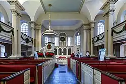 King's Chapel is an American independent Christian unitarian congregation affiliated with the Unitarian Universalist Association that is "unitarian Christian in theology, Anglican in worship, and congregational in governance."[2] It is housed in what was for a time after the Revolution called the "Stone Chapel", an 18th-century structure at the corner of Tremont Street and School Street in Boston, Massachusetts. The chapel building, completed in 1754, is one of the finest designs of the noted colonial architect Peter Harrison, and was designated a National Historic Landmark in 1960 for its architectural significance. The congregation has worshipped according to a Unitarian version of the Book of Common Prayer since 1785, currently in its ninth edition.[3]: 213