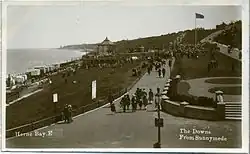 The original building was a bandstand funded in 1903–1904 by Thomas Dence (1840–1918), a local developer who had been involved in the Frome Park Estate in Stroud Green and roads in the parish of St Mary, Islington, and owned property in Herne Bay.[6][8][9][10][11] Dence had moved to Herne Bay for his health, bought the Downs, laid out roads at the top and built himself a house on Beacon Hill close by.[12] He conveyed the remaining sloping land back to the council, and in 1901 and 1903 suggested plans for a bandstand.[3][4][12] He had in mind: