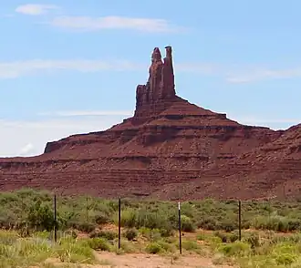 King-on-his-Throne is situated 4.4 miles (7.1 km) north-northeast of the Monument Valley Tribal Park Visitor Center, on Navajo Nation land. It is an iconic landform of Monument Valley and can be seen from Highway 163. Precipitation runoff from this landform's slopes drains into the San Juan River drainage basin.[3] Topographic relief is significant as the summit rises 565 feet (172 meters) above the surrounding terrain in 0.2 mile (0.32 km). This landform's toponym has been officially adopted by the United States Board on Geographic Names.[1] It is so named because the butte resembles a king sitting on a throne looking south to the valley.[4] The first ascent of the summit was made in 1967 by Fred Beckey, Marlene Dalluge, Joe Brown, and Don Liska.[5]