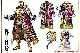 King is widely recognized for the jaguar mask that hides his true identity. Throughout his appearances in the virtual realm, the face beneath his jaguar mask remains a mystery, shrouded in secrecy. The physical portrayal of King's movements was done by the Japanese professional wrestler Minoru Suzuki, who lent his expertise to the character's motion capture sessions.[7] King is a Mexican luchador and series' one of two luchadores overall (the other being Armor King).[8] Fray Tormenta, a Mexican Catholic priest, served as an initial influence on King's character and backstory.[7] King is seen to be mostly growling throughout the Tekken series; however, according to Japanese video game director Katsuhiro Harada, King is capable of speaking Spanish, but he prefers not to.[9] Harada also revealed that King is the most popular Tekken character in Japan over the complete span of the Tekken series.[10]