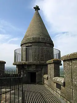 The triangular tower is over 40 m (130 ft) high with a girth of 51 m (167 ft). Each of the three corners of the triangular structure has a round projection.[8] The centre of the tower is hollow, and to stop birds from entering the space a mesh has been added at roof level. The viewing platform, which has a crenellated parapet and offers a view over the surrounding countryside, is reached by a 205-step spiral staircase at the corner furthest from the entrance.[6] The brick tower has Chilmark stone dressings and is surmounted by an embattled parapet.[17][18]