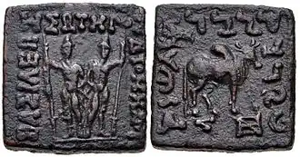 Silver coin of Diomedes. Obverse shows the King wearing a Boeotian helmet and royal diadem, with Greek legend: ΒΑΣΙΛΕΩΣ ΣΩΤΗΡΟΣ ΔΙΟΜΗΔΟΥ, Basileōs Sōtēros Diomēdou, "Of King Diomedes the Saviour". Reverse with standing Dioscuri, and the Kharoshti legend: Maharajasa Tratarasa Diyametasa, "Of the Great Saviour King Diomedes". -