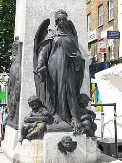 Each of the cherubs holds an object of significance to the Jewish community at the time of the memorial's unveiling. One cherub holds a ship; many members of the local Jewish community were recent immigrants. A cherub holding a needle and thread signifies the clothing industry which employed the majority of the East End Jewish community until the 1970s. A book is held by another cherub signifying the importance of education to the community both from the local secular Jewish schools and the schools of Talmudic study. A car held by a cherub shows the increasing pace of modernity and the shift away from the horse and cart in modern London.[4] The remaining face bears a relief portrait of the King wearing the Order of the Garter.[4]