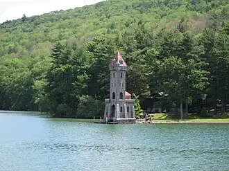 Kingfisher Tower is a 60-foot-tall (18 m) folly on the eastern shore of Otsego Lake, New York, at Point Judith. Located north of Cooperstown near County Highway 31,[1][2] the Gothic Revival tower was designed by architect Henry J. Hardenbergh for Singer Sewing Machine Company magnate Edward Clark in 1876, who built it "to beautify the lake" and "provide construction jobs during an economic turndown".