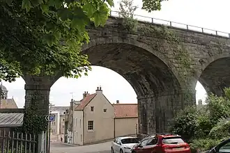 The railway viaduct (solid other than four tall arches) splits the old town of Kinghorn in half.