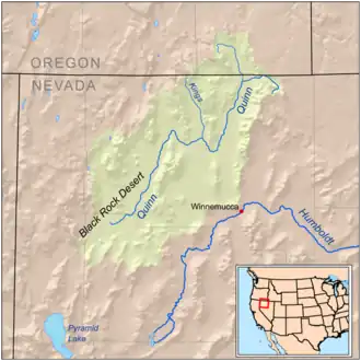 The river rises in northern Humboldt County, Nevada, west of Disaster Peak in The Granites, part of the Trout Creek Mountains, near the Oregon state line. Flowing northwest, it crosses briefly into Harney County, Oregon, then turns sharply south and re-enters Humboldt County for the rest of its course. It flows generally south between the Bilk Creek Mountains on the right (west) and the Montana Mountains, then the Double H Mountains on the left. It joins the Quinn River from the north at Quinn River Lakes. The Quinn River flows southwest from the lake to end in a sink in the Black Rock Desert west of Winnemucca.[3]